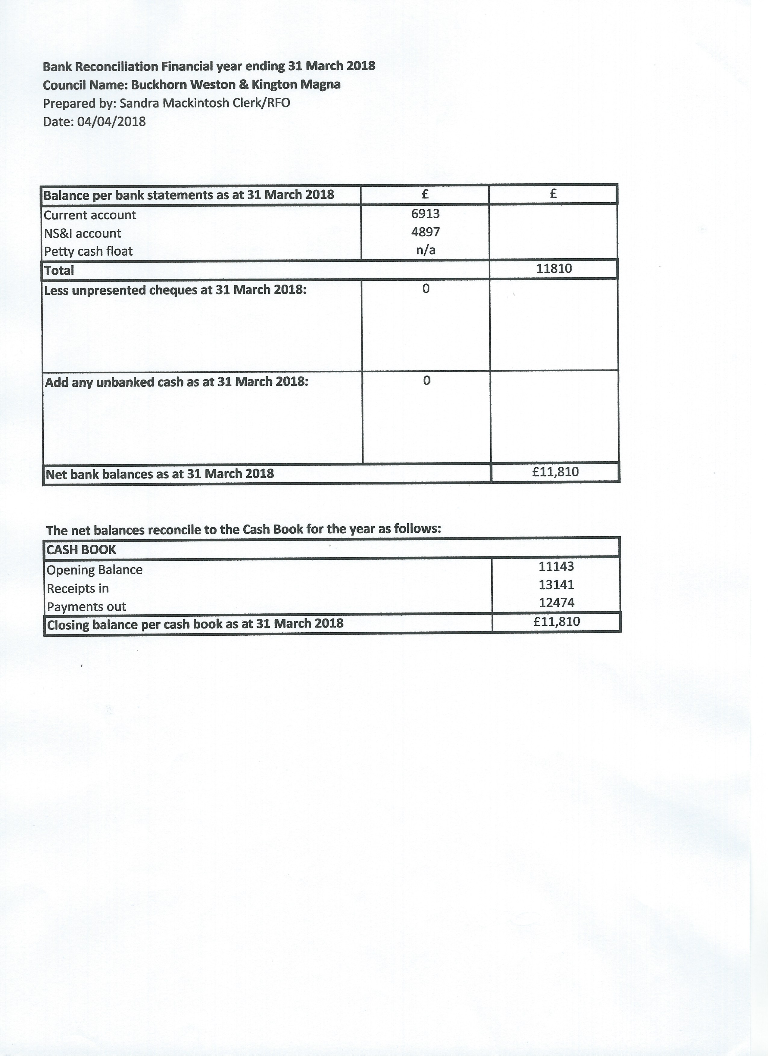 Bank Reconciliation Financial Year Ending 31st March 2018